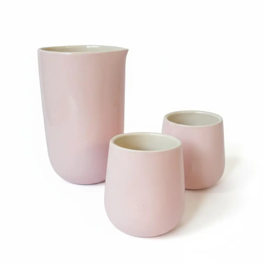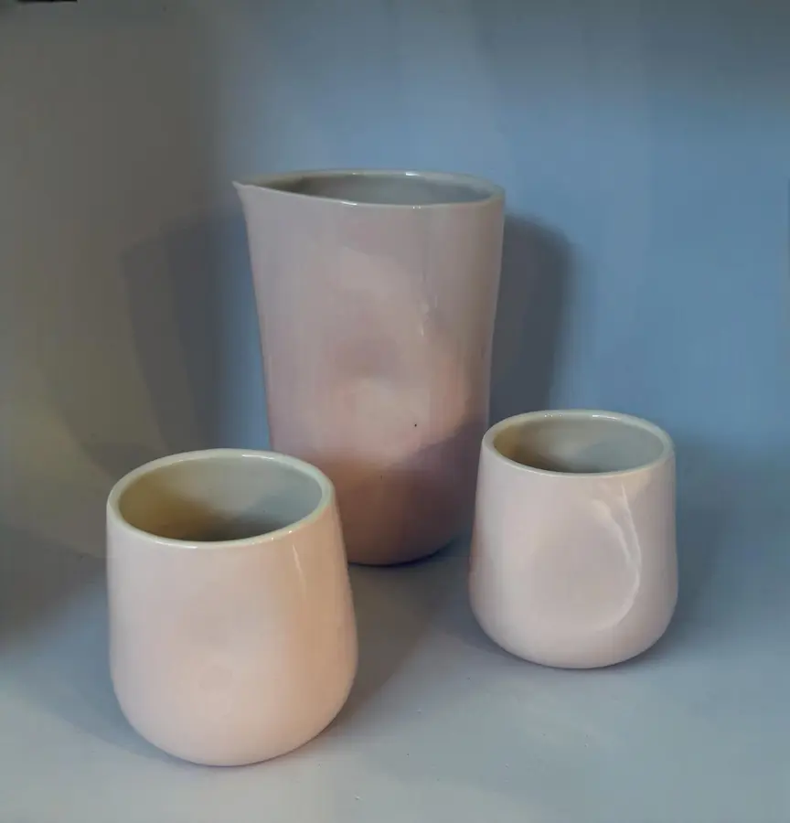קנקן + 2 כוסות מקרמיקה עבודת יד בצבע ורוד בייבי