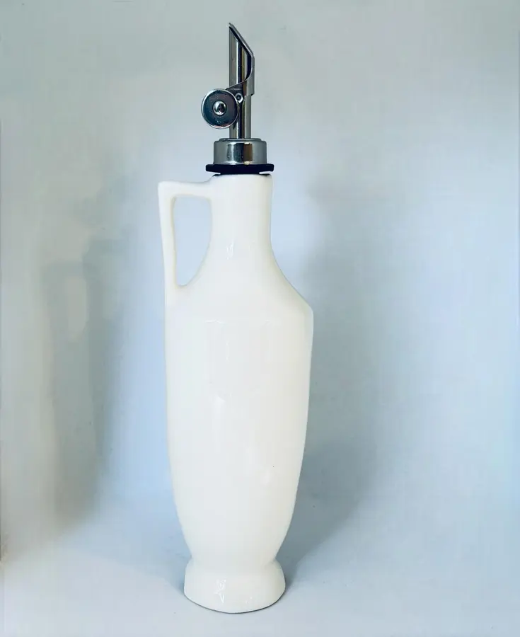 בקבוק קרמיקה בעבודת יד ונפח של 450 מ"ל , בצבע לבן כיתוב - שמן זית
