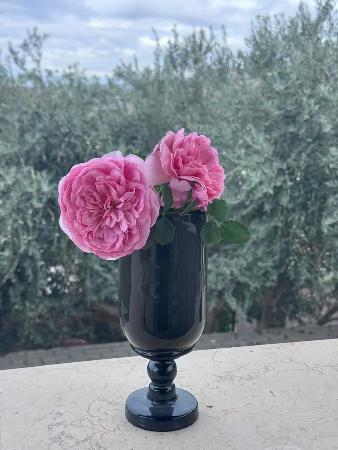 ואזה על רגל גבוהה בצבע שחור , גימור גלזורה מבריקה .