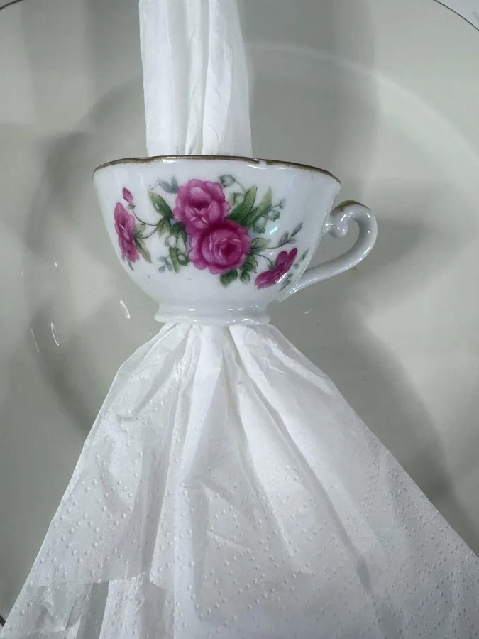 ספל פורצלן וינטג׳ שקיבל חיים חדשים והפך לחבק למפית