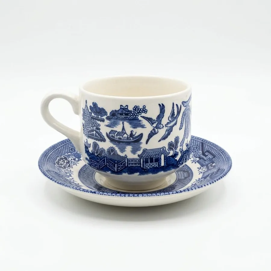 ספל וצלחת חרס אנגלי בגוונים כחול ולבן