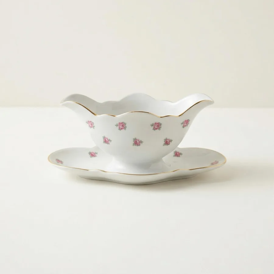 מאויר בשושנים ורודים קטנטנים כולל פס זהב בדופן הצלחת