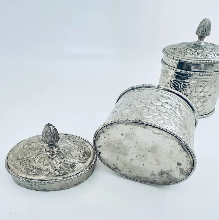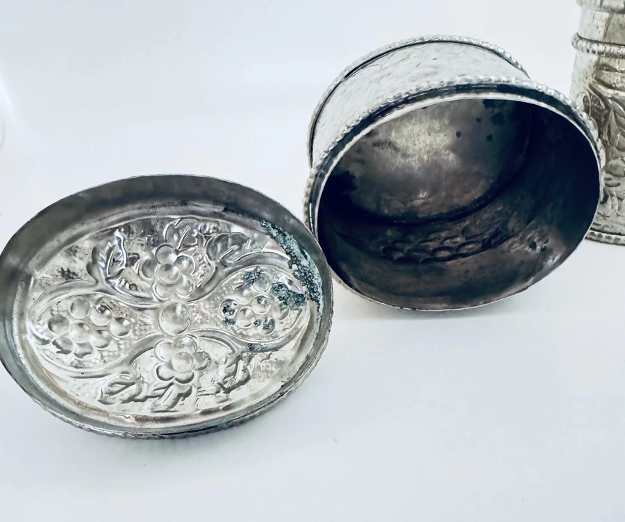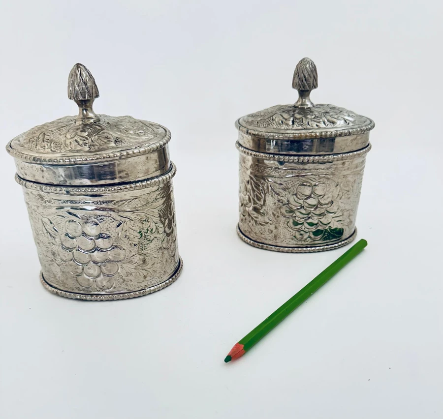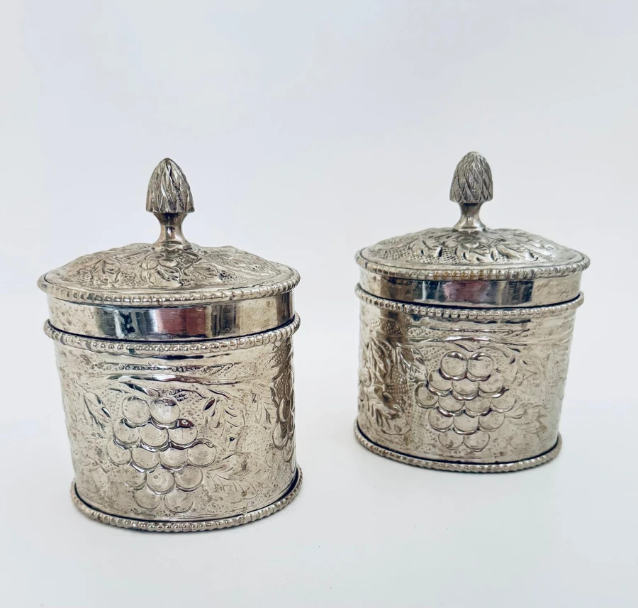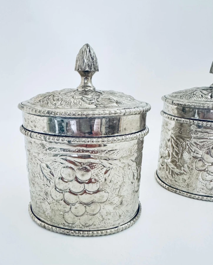 עשויה פליז בציפוי ניקל/אלומיניום, עם תבליט עשיר של אשכול ענבים ועלים.