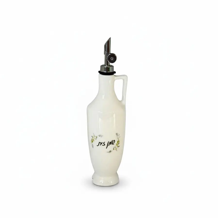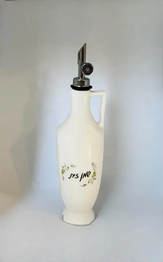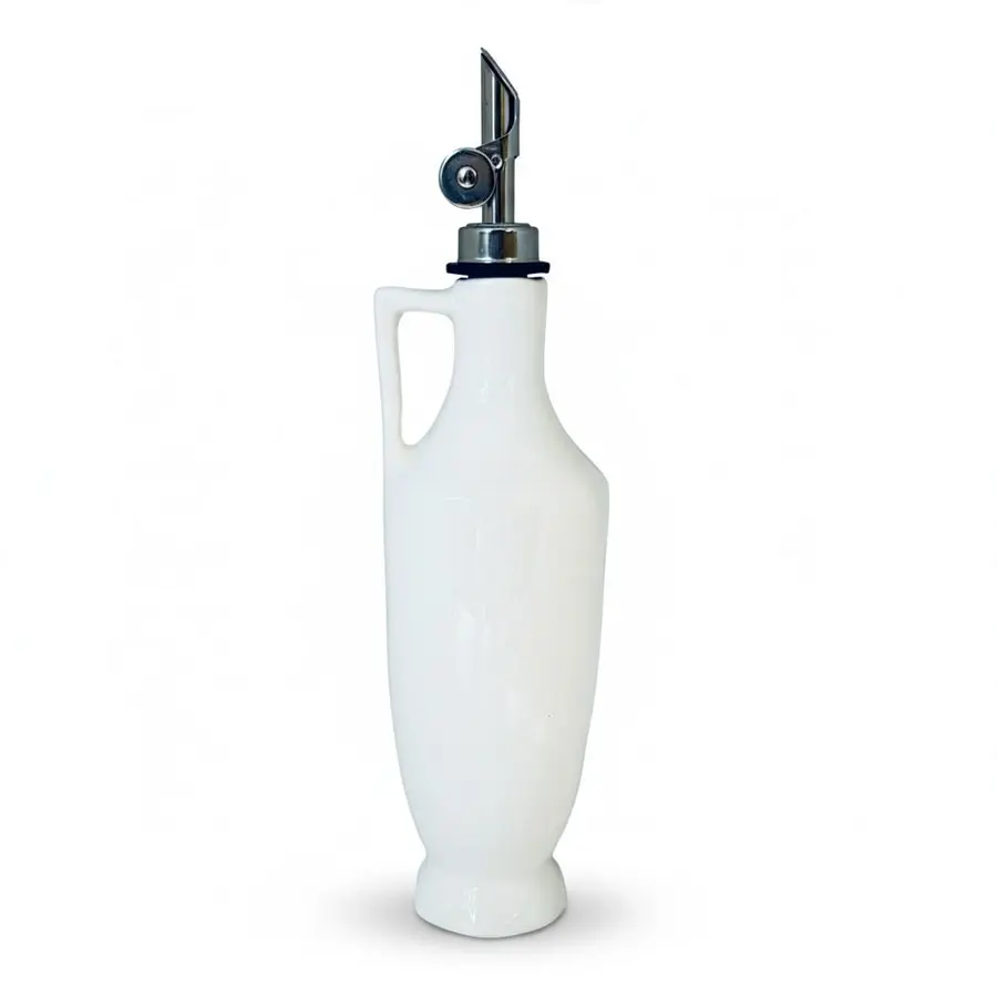 בקבוק קרמיקה בעבודת יד ונפח של 450 מ"ל , בצבע לבן כיתוב - שמן זית