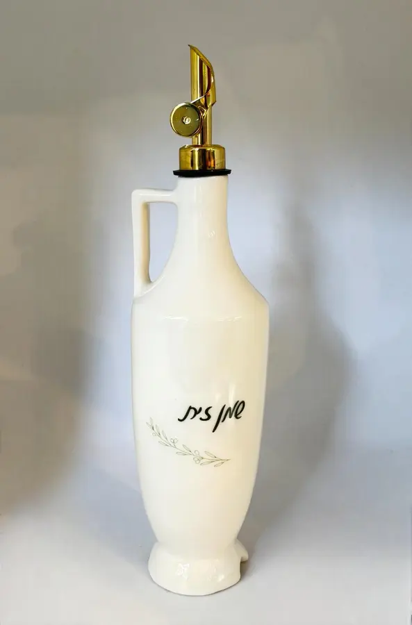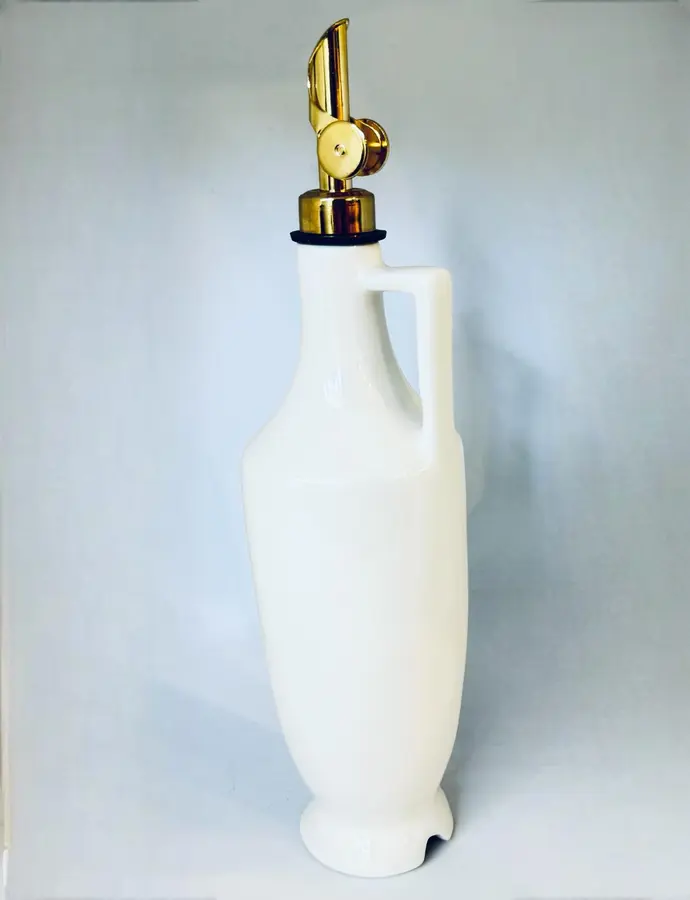 בקבוק קרמיקה בעבודת יד ונפח של 450 מ"ל , בצבע לבן כיתוב - שמן זית
