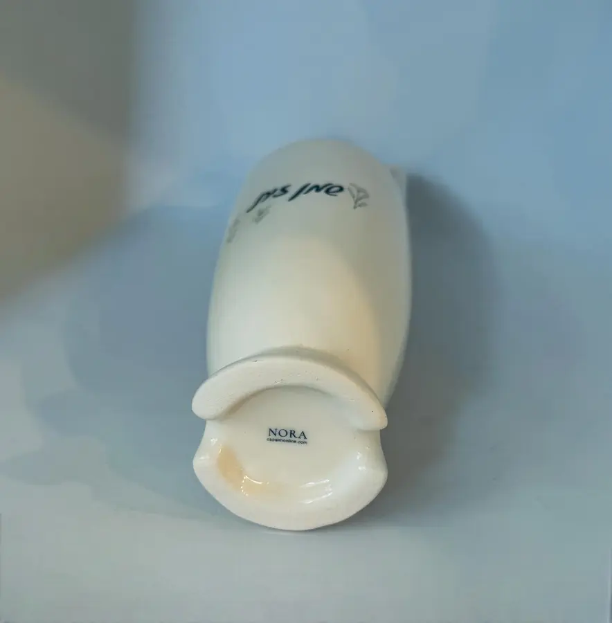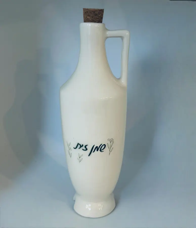בקבוק קרמיקה בעבודת יד ונפח של 450 מ"ל , בצבע לבן כיתוב - שמן זית