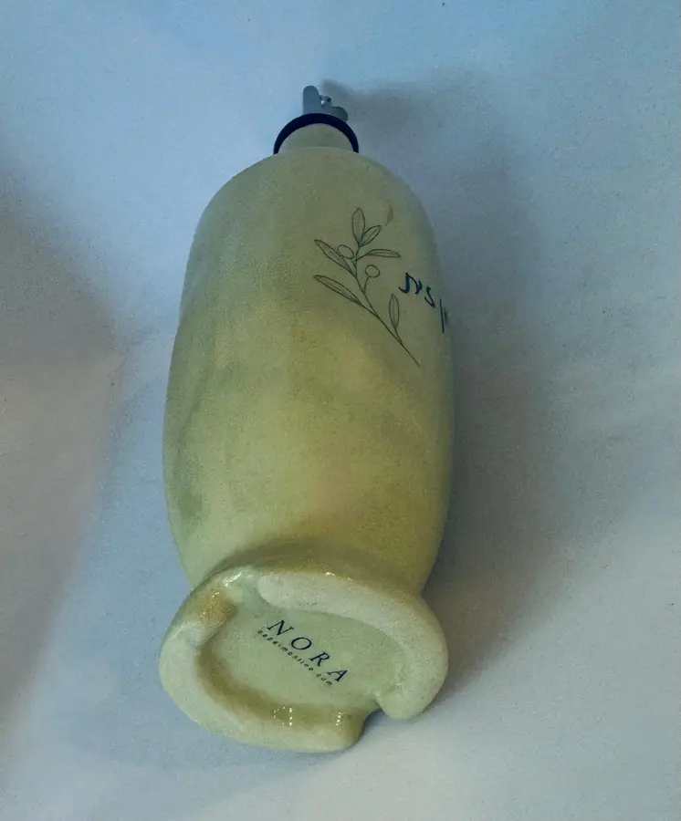 בקבוק קרמיקה בעבודת יד ונפח של 450 מ"ל , בצבע ירוק כיתוב - שמן זית
