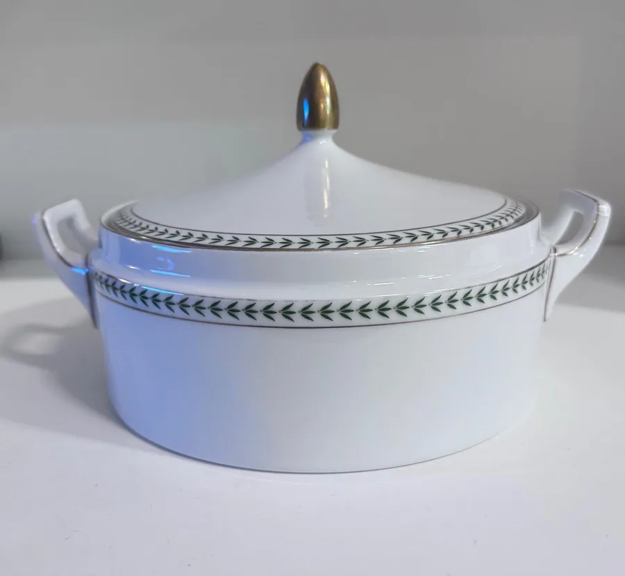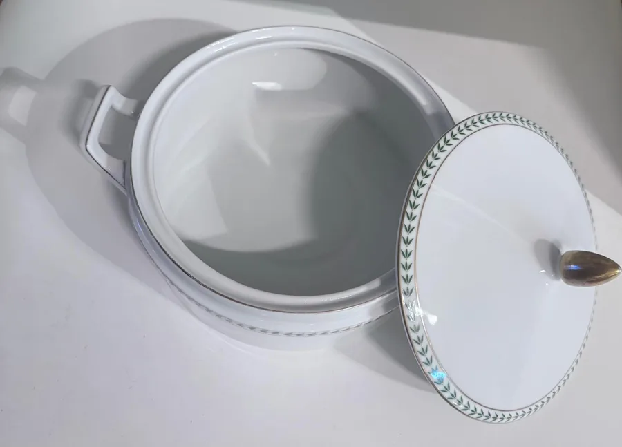 קערת הגשה כולל מכסה פורצלן , מאוירת בעלים ירוקים ופס זהב