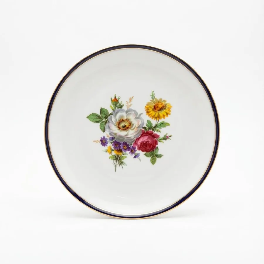 מאוירת בזר פרחים צבעוני פס כחול וזהב בשוליים .