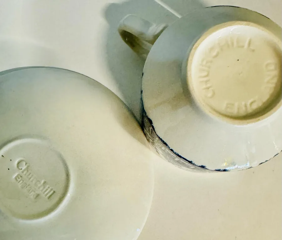 ספל וצלחת חרס אנגלי בגוונים כחול ולבן